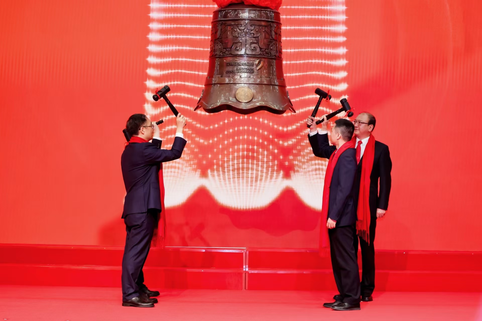 上午9时27分,陈波、闫宏光、赵桂才、吴海龙共同敲响上市钟声,现场响起热烈掌声。