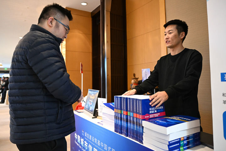 12月20日,工作人员(右)在第六届中国城市信用建设高峰论坛展区向参会嘉宾介绍《社会信用体系建设政策汇编(2024版)》。