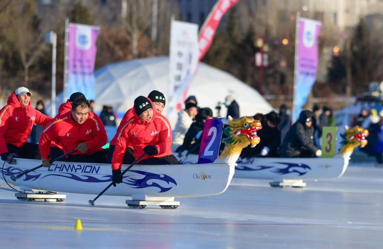 冰上龙舟作为传统龙舟运动的创新变体,将场地移至冰面,船体保留了龙舟的基本构造元素,同时底部装有冰刀或滑轮以适应冰面滑行。这项运动融合了竞技性、团队性与娱乐性,让参与者在冰面上体验风驰电掣的刺激,能够极大地激发人们的冰雪运动热情。