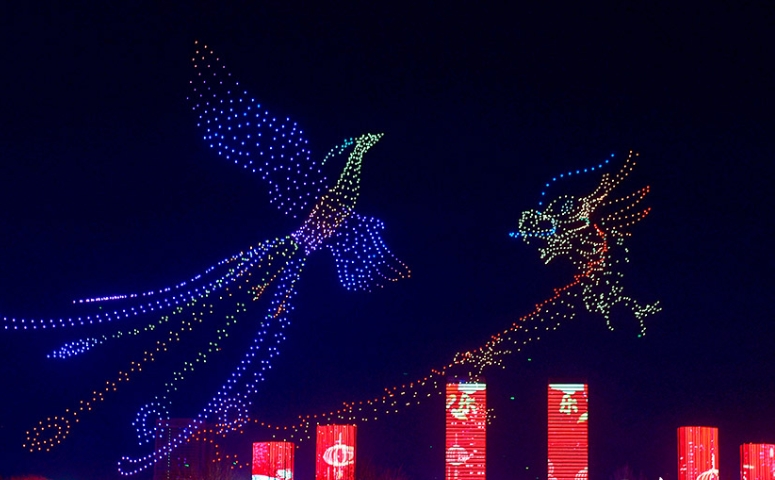 当晚,随着夜幕降临,2025架无人机在乌兰木伦湖畔腾空而起,宛如星辰点缀夜空。它们以夜幕为画布,缓缓展开了一幅幅生动的画面。首幅画面“巳巳如意 生生不息”尤为壮观,甲骨文“巳”字幻化为灵蛇吐信的造型,双蛇并肩盘绕成“2025”数字,蛇身缀满繁星,寓意着蛇年吉祥、万事顺遂。紧接着,龙凤呈祥、舞狮送福等图案跃然天际,烘托出浓浓的节日氛围。