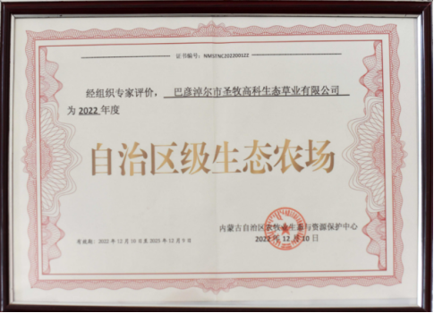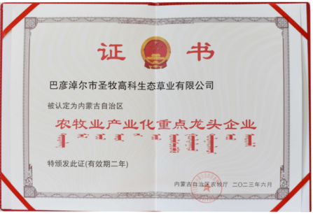 圣牧草业党支部书记、总裁刘文光同志先后获得“国家农业农村部劳动模范”、“内蒙古自治区五一劳动奖章”、巴彦淖尔市“五一劳动奖章”等荣誉称号。圣牧草业在刘文光同志的带领下,先后被国家税务总局评为“2022年度纳税信用评价A级纳税人”;被内蒙古自治区农牧厅授予“自治区级生态农场”荣誉称号;被内蒙古自治区农牧厅授予“内蒙古自治区农牧业产业化重点龙头企业”荣誉称号;圣牧草业旗下“源漠优品”品牌有机产品荣获第十五届中国国际有机食品博览会金奖。2024年8月,全国第二家“钱学森沙产业理论实践基地”落户圣牧草业乌兰布和沙漠有机示范园。圣牧草业已经获得农业农村部中绿华夏有机认证中心颁发的有机产品认证证书和北京爱科赛尔认证中心颁发的欧盟有机认证证书。