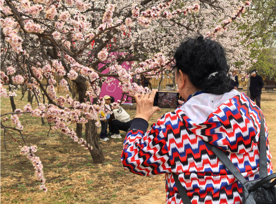 “杏花真是太美了!走入这美景,便成了画中人。我分享的杏花照片,已经被朋友们刷屏了。”在游人如织的步道上,架起相机捕捉杏花绽放的游客赵阿姨边说边展示自己的微信朋友圈。