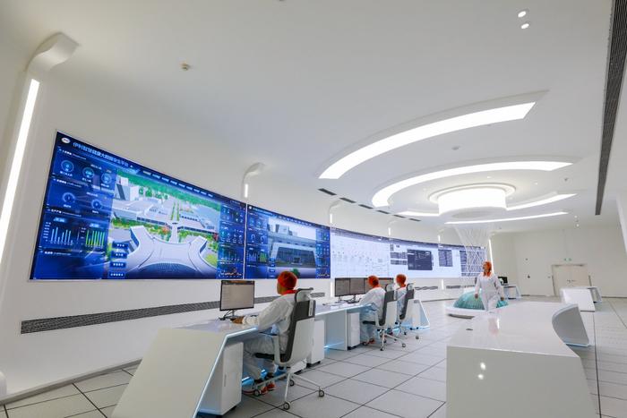 在伊利健康谷智控中心,工作人员通过大屏对生产全过程进行实时监控