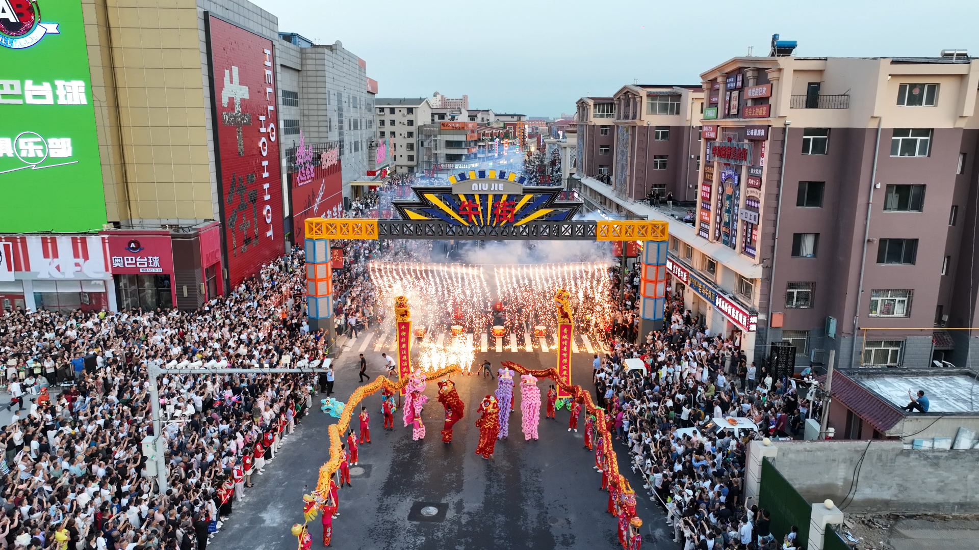 夜幕初降,五彩霓虹灯光勾勒出整条街道轮廓,人群穿梭于敞亮的特色店铺间,谈笑声、美食香气与店家的招呼声此起彼伏。随着舞龙舞狮队伍蜿蜒穿行,气势如虹的龙狮时不时腾空跃起,引得围观群众阵阵喝彩。夜空适时绽放绚丽烟花,将整片街区染成梦幻色彩,不少游客迫不及待地举起手机,记录下这璀璨一刻。市民王女士兴奋地说:“我一直在关注牛街改造,今天特意带着家人过来。这些复古刀牌配上霓虹灯太有感觉了,而且店铺环境升级后,吃美食都更有氛围了。”