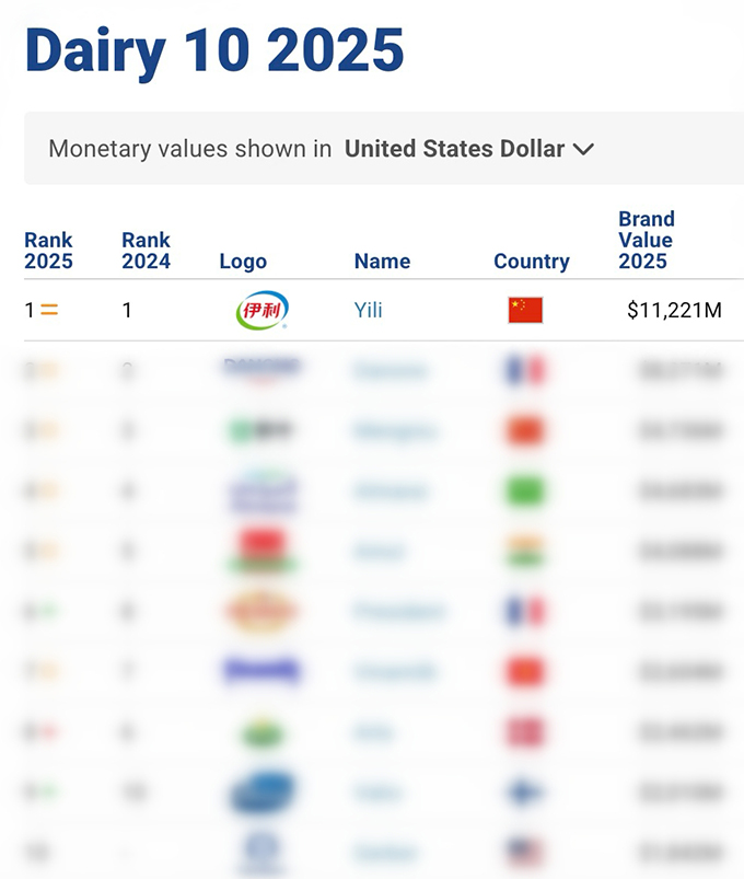 香港文汇网内蒙古频道8月9日讯(记者 薛萍)8月6日,国际品牌评估机构BrandFinance发布“2025年全球最具价值乳品品牌10强”榜单。伊利连续第六年稳居榜首,持续领跑全球乳业。