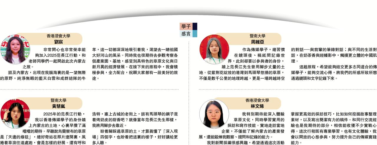 作為傳媒學子,總習慣在鏡頭後、稿紙間記錄世界,此刻卻要以參與者的身份,踏上范長江先生曾用腳步丈量的土地。從紫荊花綻放的港灣到馬頭琴悠揚的草原,不僅是數千公里的地理跨越,更是一場跨越時空的對話─與前輩的筆鋒對話;與不同的生活對話,在奶茶香與經幡影中,觸摸更立體的中國肌理。