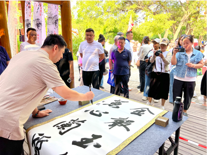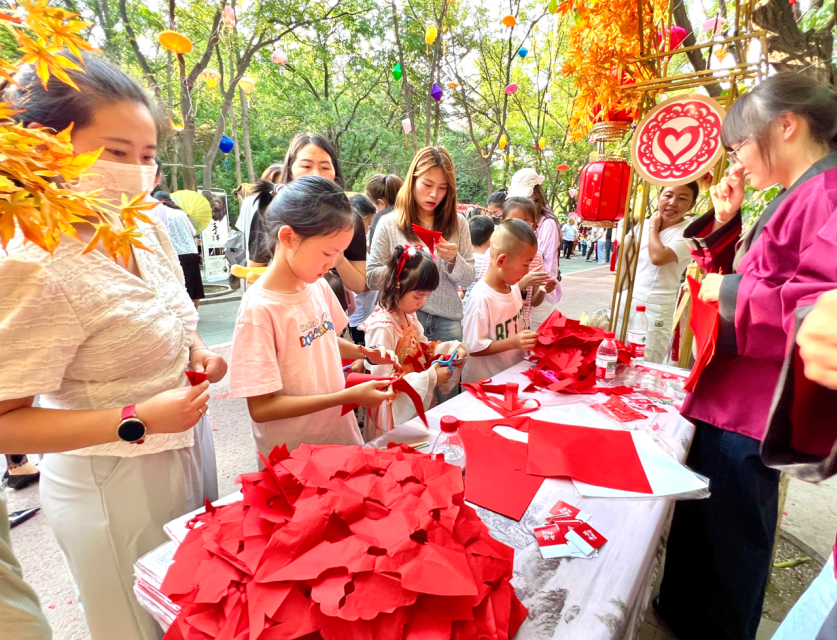 作为活动人气焦点之一,“鹊梦星河·国风雅集”国风集市以“爱情时光轴”为核心,打造六大主题体验区,涵盖趣味打卡、非遗展示、文创售卖等项目,现场人头攒动、热闹非凡。集市上每个摊位前都排起长队,市民体验剪纸、书法、七巧板等项目,换上汉服穿梭于集市中,仿佛“穿越”回古代。除此之外,市民参与打卡互动游戏集齐贴纸,还可以兑换爱心发夹、四合木河灯等纪念品,此环节更让集市充满互动乐趣,充分体现高参与度。