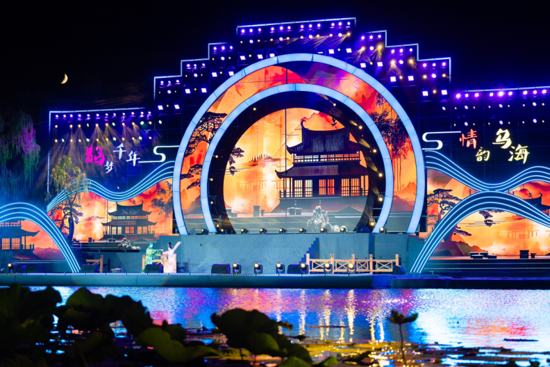 沉浸式实景演出是本次活动的核心亮点,夜幕降临,三场演出层层递进,将节日氛围推向高潮。《鹊桥仙 千古之约》实景剧,以牛郎织女鹊桥相会的经典故事为蓝本,生动演绎七夕节蕴含的矢志不渝爱情观与民族精神;随后的舞剧《千古诗韵 爱在人间》,串联《凤求凰》《梁祝化蝶》《红色爱情》等6个古今经典爱情故事,从个人情愫延伸至家国大义,演员们的精湛表演引发观众情感共鸣。