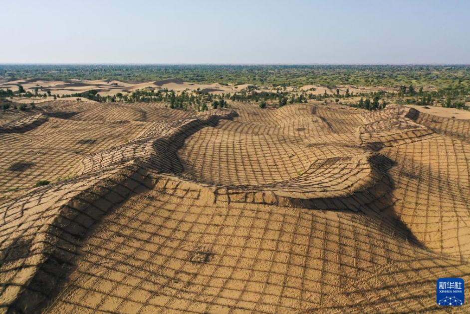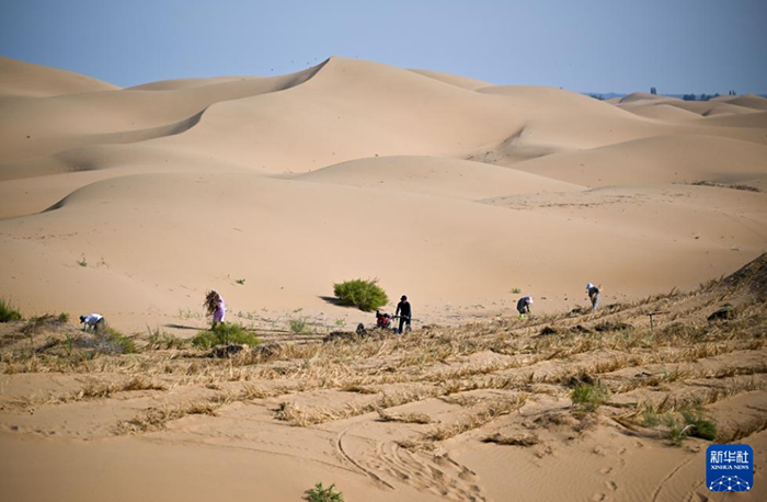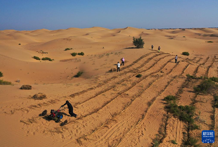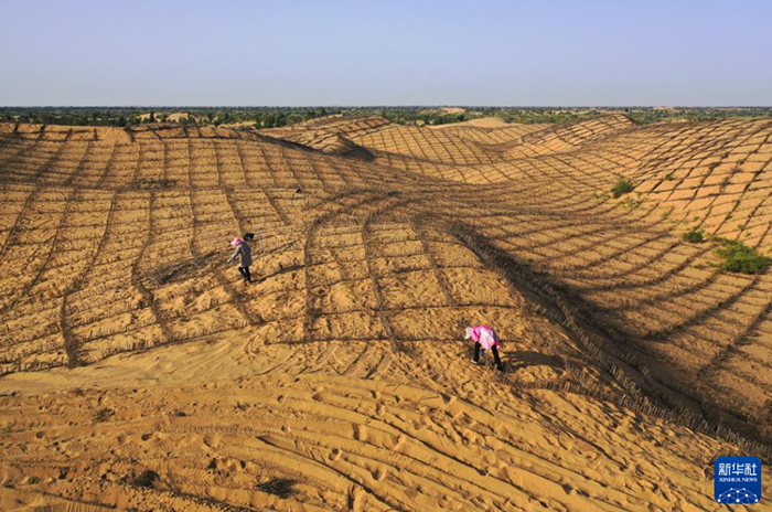 秋日,在内蒙古鄂尔多斯市杭锦旗境内的库布其沙漠,治沙工人忙碌地铺设沙障,进行库布其沙漠治理。近年来,杭锦旗有序推进荒漠化防治工作,实施建设库布其沙漠锁边林草带、风沙路径阻隔带、光伏治沙带等治沙项目,促进库布其沙漠生态环境改善。