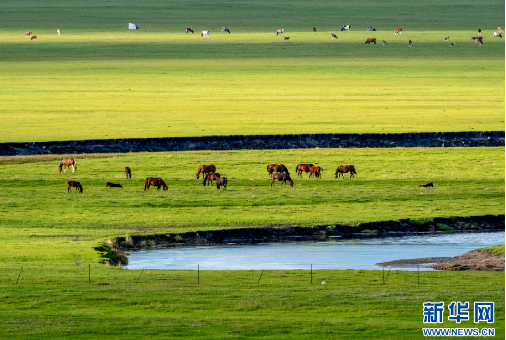 2025年8月19日,在内蒙古呼伦贝尔市陈巴尔虎旗,马群在莫尔格勒河畔吃草。新华社记者 马金瑞 摄