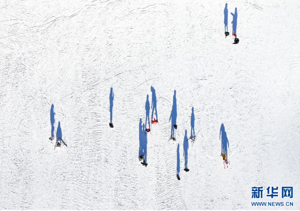 2024年11月16日,滑雪爱好者在扎兰屯市金龙山滑雪场滑雪(无人机照片)。新华社记者 连振 摄