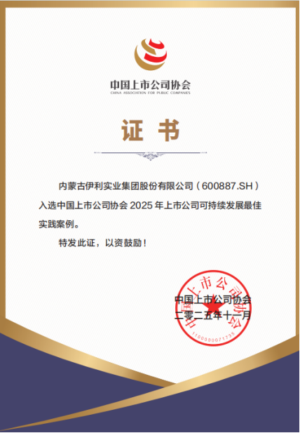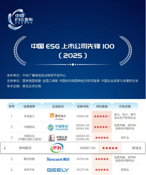 伊利的履责行动赢得了国内外权威机构的广泛认可。在ESG中国·创新年会(2025)暨首届ESG国际博览会上,中央广播电视总台“中国ESG发布”活动成功发布《2025年度ESG行动报告》《供应链ESG行动报告(2025)》,伊利连续3年稳居“中国ESG上市公司先锋100”指数行业第一,位列今年首次发布的“供应链ESG先锋50”指数行业第一。凭借在ESG方面的优异表现,伊利入选中国上市公司协会“2025年上市公司可持续发展最佳实践案例”,连续6年获得中国社科院“五星佳”可持续发展报告最高评级,在MSCI最新ESG评级中,伊利连续4年评级提升获得AA评级,这是目前中国乳企的最高评级,处于全球领先水平。