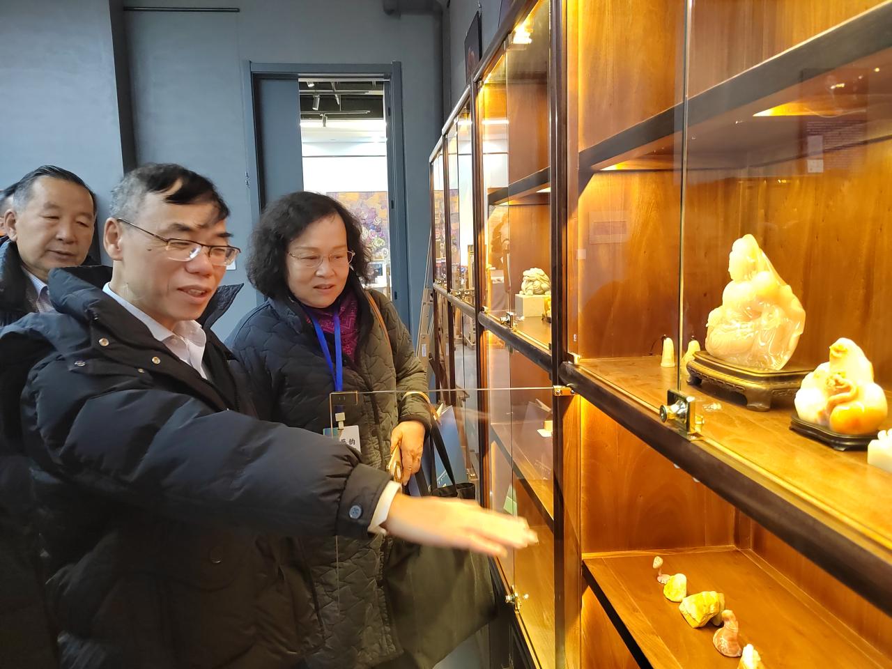 在设在学校艺馨楼内的“鄂尔多斯市刘传斌技能大师工作室”,中国工艺美术大师、福建省级非遗传承人刘传斌为大家介绍了利用内蒙古当地的玉石石材创作的诸多作品。刘传斌擅长玉石雕刻及篆刻,近四十件作品获国家级及省级金奖,十余件被故宫博物院等收藏,现受聘为内蒙古民族幼儿师范高等专科学校教授。作为学校引进的人才,他聚焦北方传统工艺研究,推动南北工艺交流,积极助力内蒙古非遗文化传播,将为内蒙古乃至全国培养更多兼具传统技艺与现代视野的工艺美术人才。