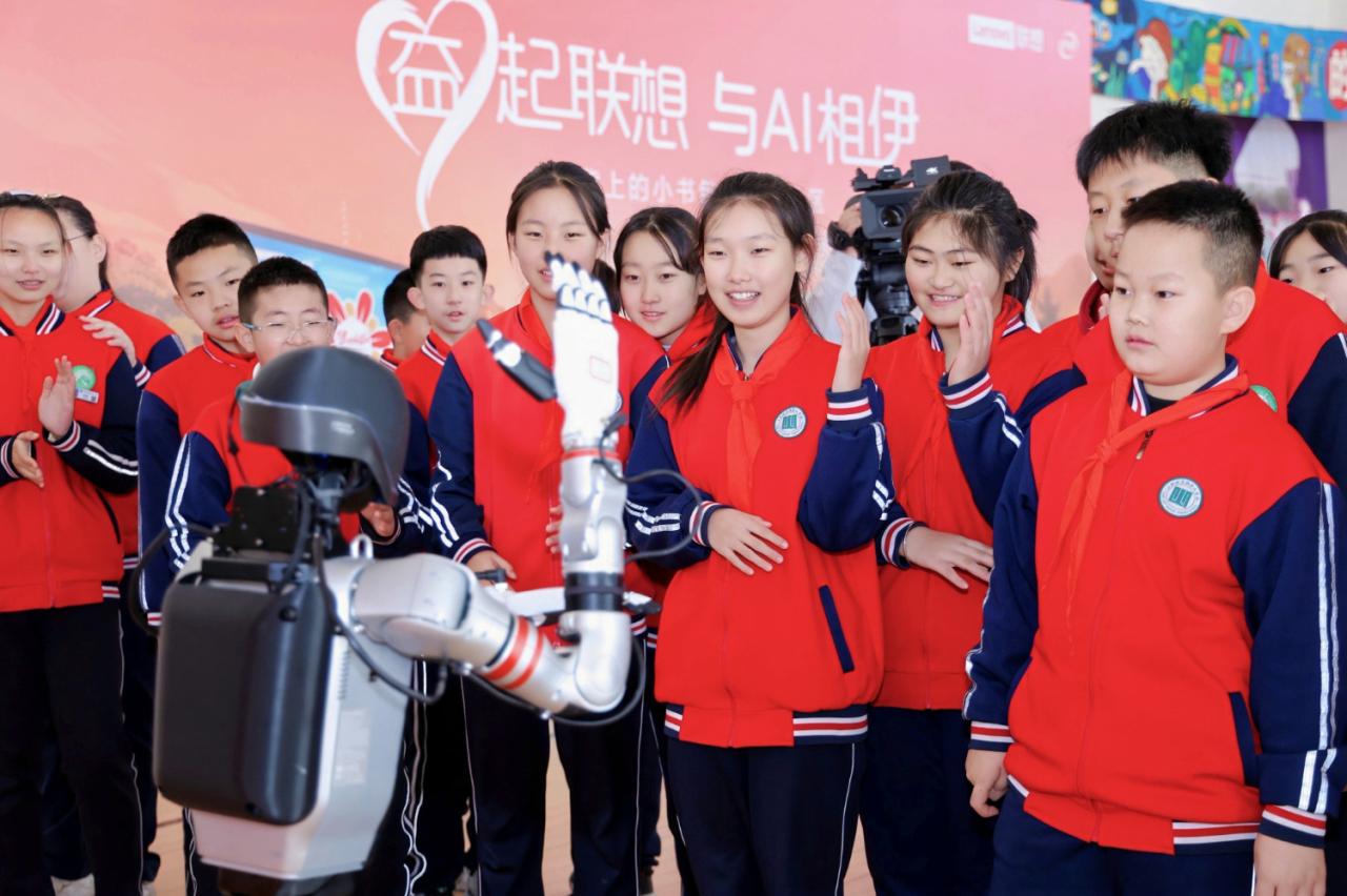 最先亮相的是联想首位硅基员工“乐享壹号”。它不但参与了捐赠仪式,还带着孩子们一起打起了太极,孩子们瞬间围拢过来,迫不及待地和它问答、互动。
