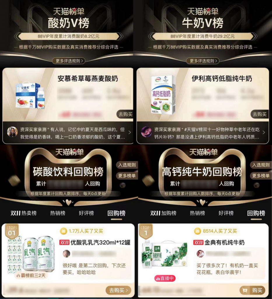 天猫平台,伊利实现品类渗透率的稳步提升,取得天猫乳饮行业品牌榜TOP1。其中,利用天猫新品创新中心(TMIC)实现消费者共创,安慕希国潮IP定制装上市即售罄;通过天猫超市全域增长引擎(UGE)样板打造,高效沉淀品牌会员,获得品牌馆会员数TOP1的佳绩,成为天猫超市品牌消费金唯一引导成交破千万品牌。