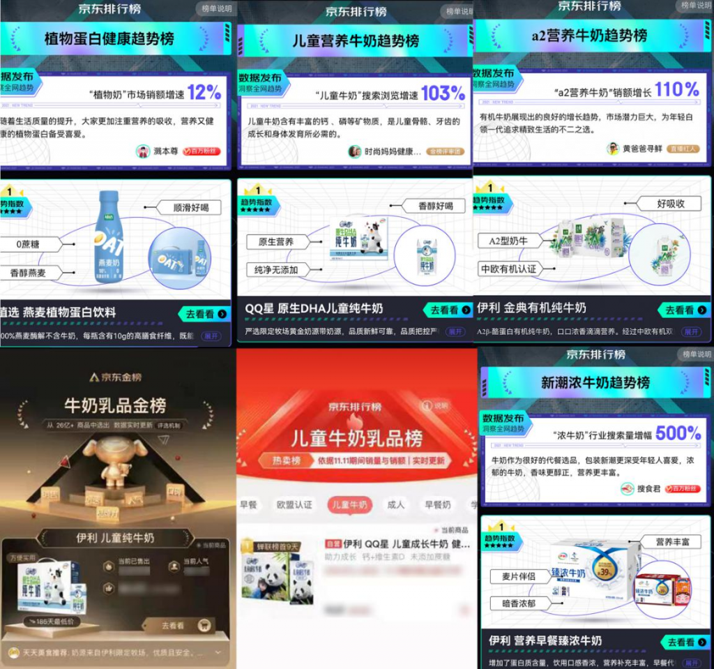 抖音平台,伊利打造直播店铺矩阵模式,通过千余场直播、短视频种草的双引擎推动下,稳居乳饮冲调行业品牌、店铺直播矩阵双料第一名。同时,抖音官旗店铺双11期间会员新增过万、乳品行业会员新增TOP1,实现行业全方位领跑!此外,伊利围绕健康场景研发的“植选植物椰浆酸奶”在抖音、小红书实现千万级曝光,并依托微信小程序完成细分人群的私域沉淀及销售闭环,预售期内全面售罄。
