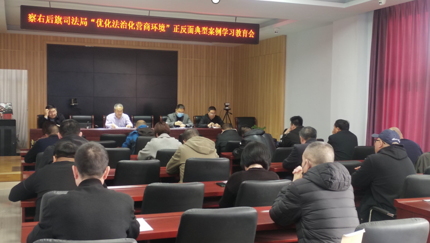 为了进一步深入推进“迎接二十大、优化法治化营商环境、服务保障高质量发展”大讨论活动走深走实,充分发挥正面典型案例的引导示范作用和反面典型案例的教育警示作用,3月28日,察右后旗司法局召开“优化法治化营商环境正反面典型案例”学习教育会,全体干部参加了会议。