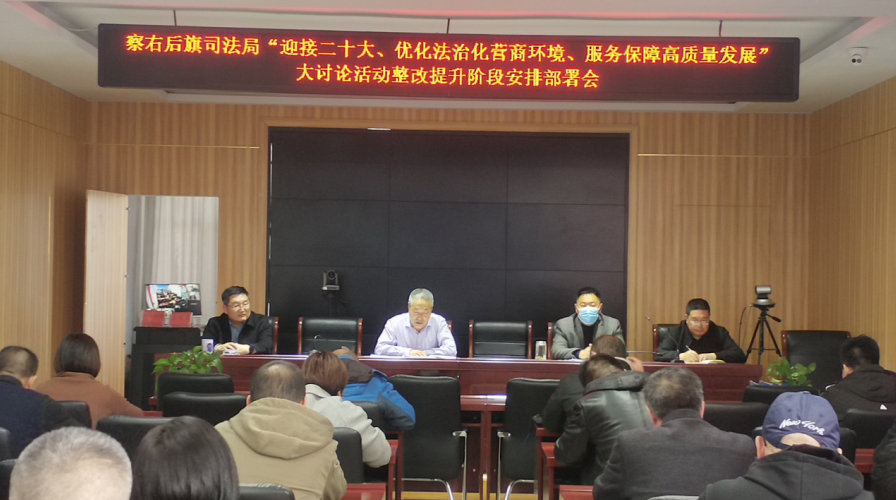 按照全区政法系统“迎接二十大、优化法治化营商环境、服务保障高质量发展”大讨论活动的部署,3月29日,察右后旗司法局召开“迎接二十大、优化法治化营商环境、服务保障高质量发展”大讨论活动整改提升阶段安排部署会,会议由司法局局长曹雪峰同志主持,会议邀请旗纪委监委派驻政法委纪检监察组组长苏和巴特尔参加,司法局全体人员参加了会议。