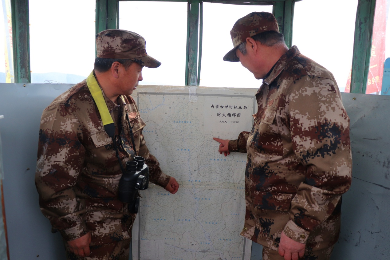 正午十分,塔高风硬,寒气袭人,笔者在摇晃的塔上紧握着铁栏杆,可视范围内河流交错、沟壑纵横,头顶飘浮着一朵朵如雪的白云。“你看咱们的瞭望半径还是被西北的大山挡住了,但西南方向山势平缓,紧要的时候我们还是多关注一下瞭望死角,有什么状况第一时间报告,可耽误不得……”“是啊,这张图标注的很清楚了,哪些是重点雷击区,我们都能做到心里有数,咱们可绝不打无准备之仗。”瞭望塔上张殿波和齐涛两个人你一言我一语说个不停,还不时放下望远镜,下意识地揉了揉被大风吹得干涩的眼睛。他们就这样警惕地瞭望着阡陌中横的原野和潺潺流淌的河流,虔诚地守望着雄浑巍峨的伊勒呼里山,定时向公司森防指报告天气、风向等情况。
