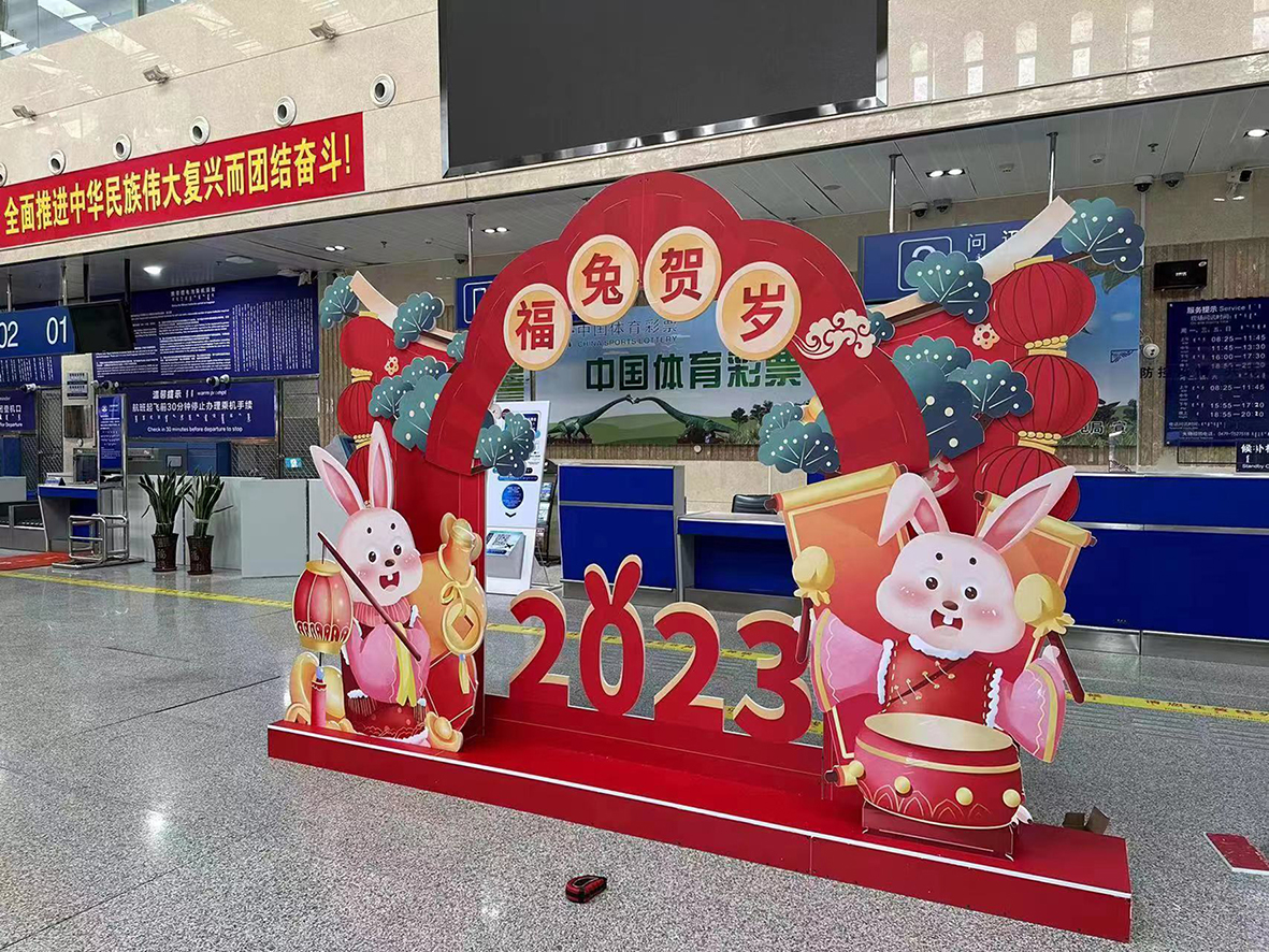 一走进机场大厅,便体会到浓浓的“年味”。值机柜台、安检验证柜台、贵宾室等区域分别放置了款式多样的兔年元素摆件,中国结、福字、传统贴花等在候机楼内随处可见,“中国红”主色调的装饰,让旅客感受到浓厚的节日氛围。