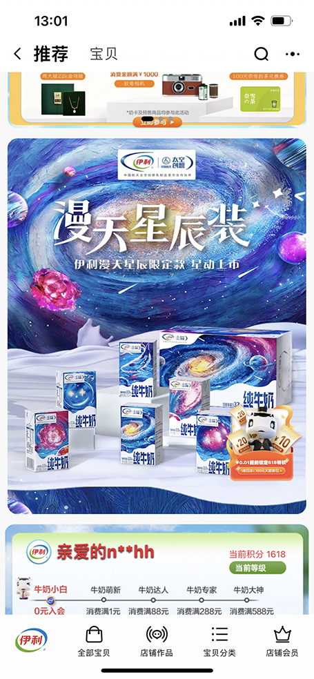 随着近年航天热度不断攀升,航空航天成为了备受消费者瞩目与期待的热门话题。伊利专门打造了共探梦幻星辰的漫天星辰纯牛奶定制装,并在成都太古里开启沉浸式星辰体验直播,重现浪漫星系,让更多消费者近距离感受航天的美丽。