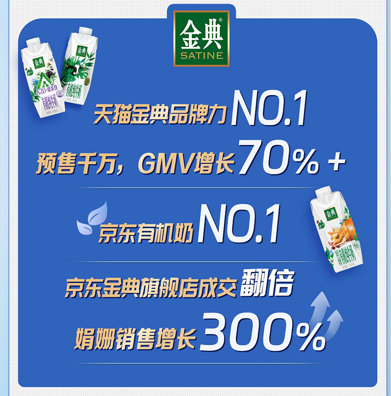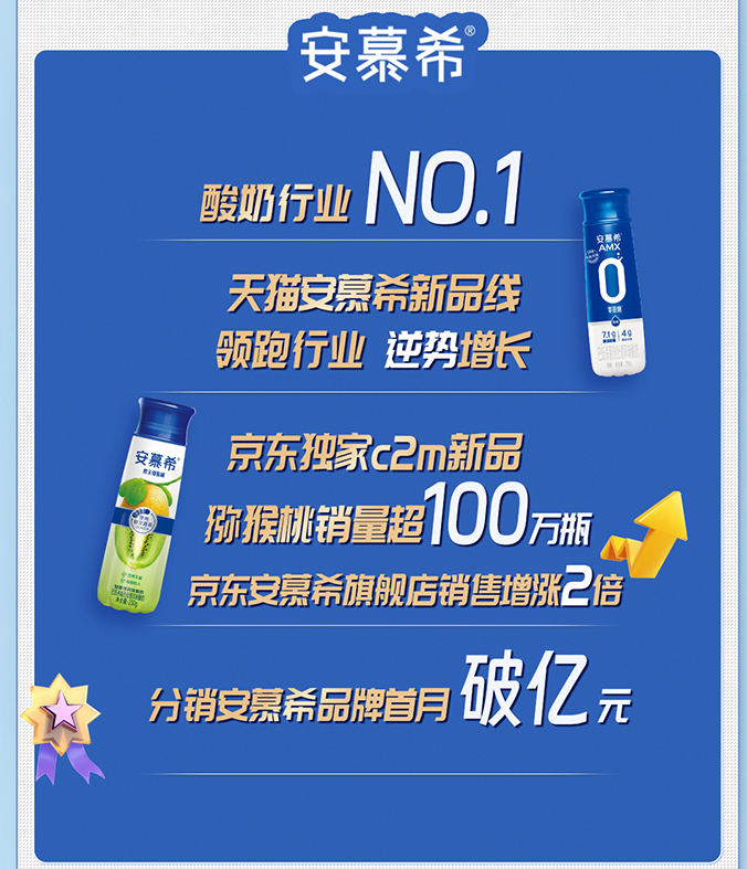 伊利持续完善品牌的生态系统布局,丰富产品矩阵,并在618期间,重点依托多款多领域、多赛道的新产品及明星产品,强势横扫各大渠道,引领品类第一。在有机系列和常温酸奶品类拔得头筹,在无乳糖品类和儿童奶品类销量行业第一;天猫金典旗舰店预售破千万,登顶乳饮品类店铺NO.1,天猫安慕希0糖和全线水果口味逆势实现双位数高增长;京东有机奶份额第一,安慕希修文猕猴桃销量超100万瓶,POP渠道常温酸奶销售额行业第一;抖音QQ星儿童牛奶同比增长200%+;京东pop渠道浓牛奶赛道销量第一。
