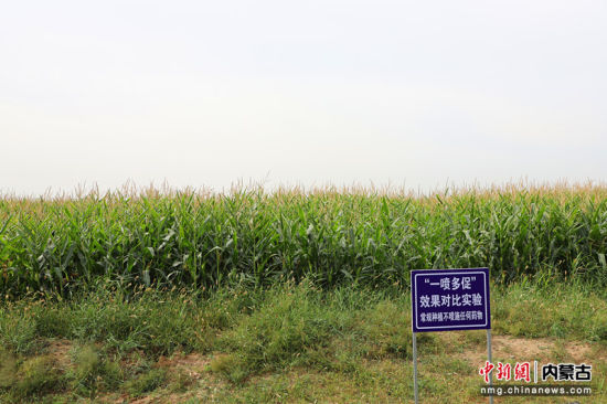 内蒙古阿尔格生命科学有限公司销售部经理索耀文告诉记者,“‘一喷多促’使用的药剂,可以提高植株光合作用,促进玉米灌浆,促进籽粒饱满,增加玉米产量。”索耀文说。