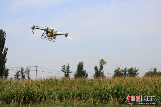 中新网内蒙古新闻9月1日电(记者 张林虎)眼下秋粮生产进入关键期,为确保秋粮稳产增产,连日来,呼和浩特市托克托县农牧推广中心运用无人机智能设备开展玉米田“一喷多促”社会化服务工作,为玉米“保驾护航”,确保秋粮增产丰收。