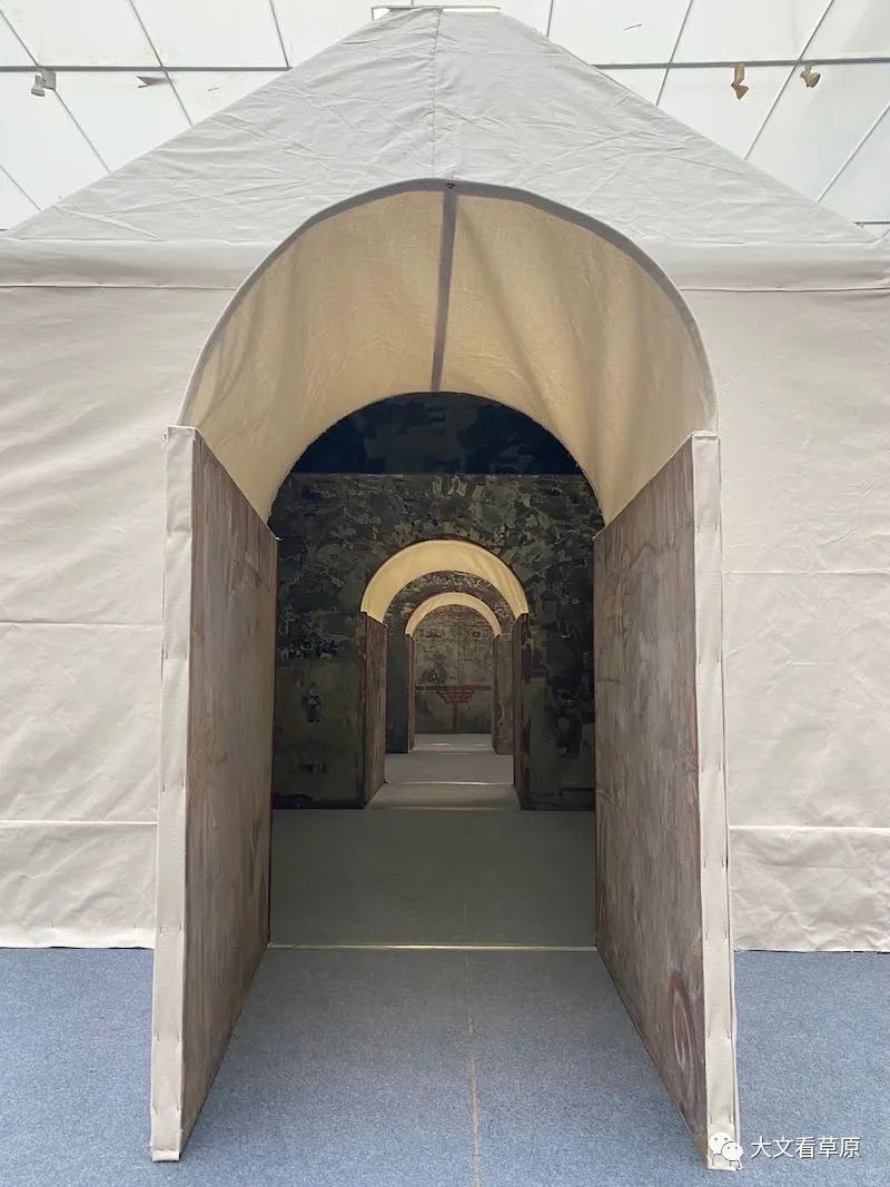 内蒙古和林格尔东汉墓室壁画,位于呼和浩特市和林格尔县新店子村西,是描绘东汉时期各民族融合的珍贵画卷。这座1800年前的墓室不开放参观,但其壁画却在上海以摹复的方式展出。9月3日,“‘全息摹复焕丹青’——和林格尔东汉墓室壁画整体摹复”及中国古代壁画非本体再现展学术研讨会在上海大学上海美术学院美术馆举行,展览现场复原了墓室和甬道,观者可感受1:1等大的和林格尔东汉墓室壁画。
