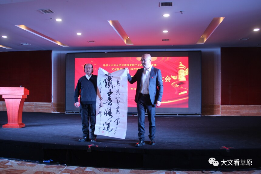 会议现场,内蒙古体育发展基金会聘请乔夫主席为基金会体育文化总督导,研究会聘请敖拉理事长为研究会顾问兼文体总督导。