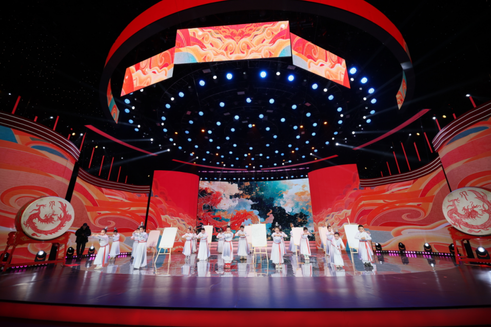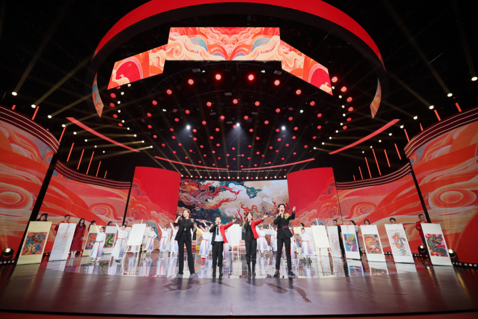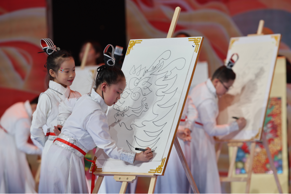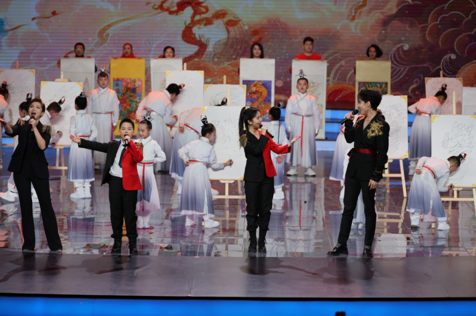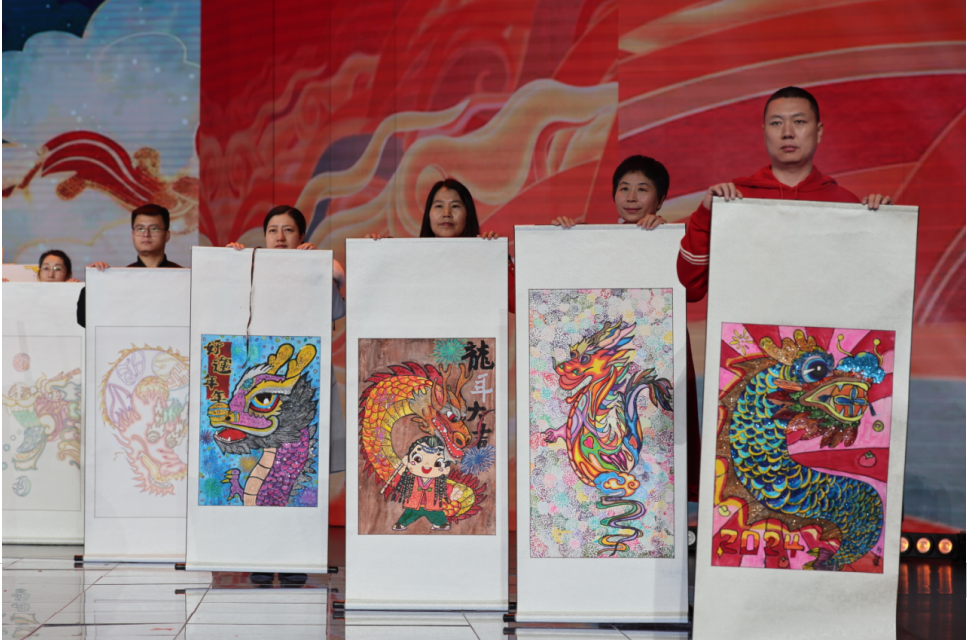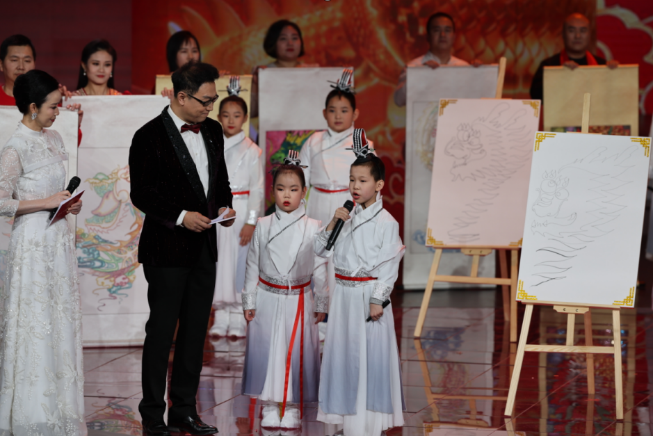 在晚会现场以歌舞画于一体的创意歌舞节目《龙颜》成为了独具特色的焦点 。晨旭艺校的孩子们以国风服装、太极元素的舞蹈和画作展示了中国的龙年精神。孩子们身着精致的国风服装,伴随着原创龙年主题歌曲《龙颜》的优美旋律翩翩起舞。他们的舞蹈中融入了太极元素,展现了中华文化的独特魅力。而画作部分更是令人惊叹,11名小画家仅用1分25秒的时间,用一笔画的技法一气呵成地在画板上完成了一条栩栩如生的金龙。此外,还有16名小画家以自己的名字为创意元素,创作了彩色钢笔画和龙年主题年画作品《龙的传人》。这些画作与舞蹈和画作相得益彰,让现场的领导和嘉宾深感《龙颜》节目的独特创意的力量。