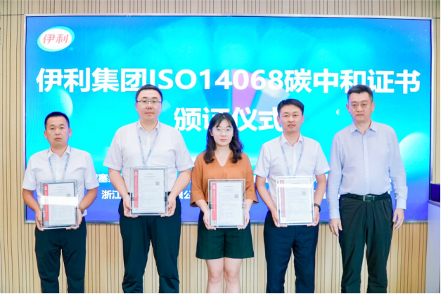 必维集团代表(右一)为伊利产品和工厂颁发ISO14068“碳中和”证书