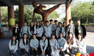 同學們在李小龍雕塑前合影留念。(記者王月 攝) (香港文匯網記者 喬輝、王月)在「范長江行動—首屆內蒙古傳媒學子香港行」活動中,學子們懷揣着對香港多元文化的好奇與期待,走進了香港文...