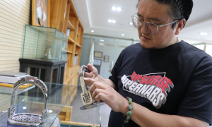 敖日格勒还将濒临失传的手艺——金银错运用到蒙古族马鞍的制作中。王月摄影 敖日格勒手绘图样。王月摄影 敖日格勒与恩师恩和达瓦合影。受访者提供 敖日格勒在蒙古族马鞍制作工艺上赋予了新的...